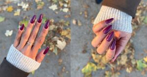 I’m losing it over these cranberry pink fall nails, girl! The deep, glossy cranberry shade is so rich, like a fall harvest fruit.