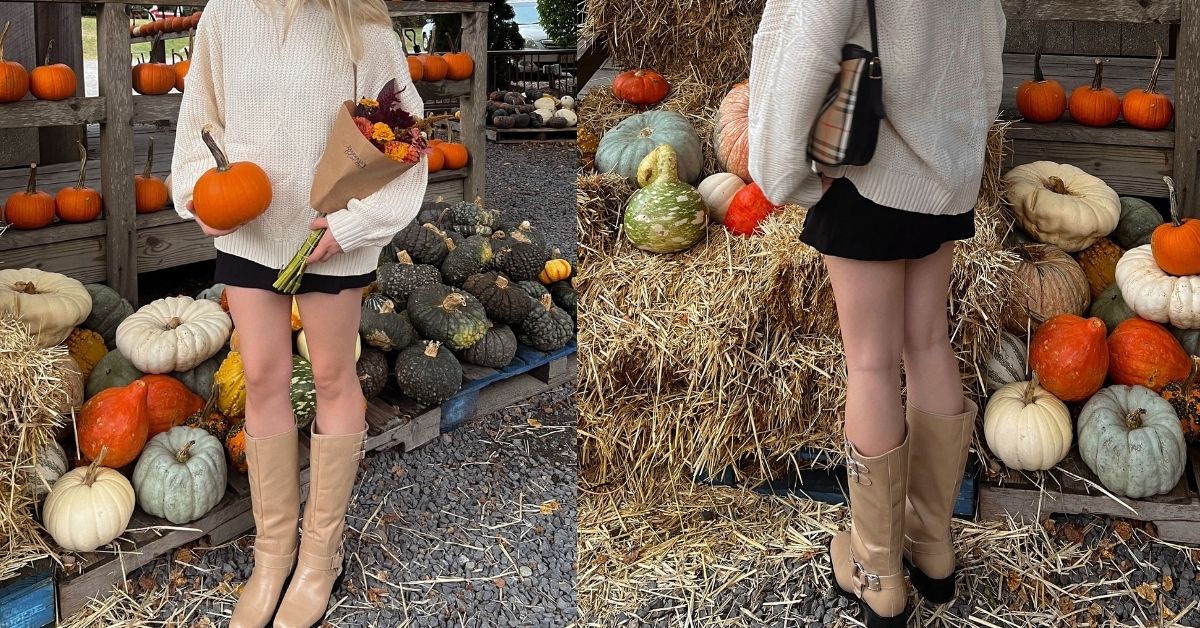 Mini skirt, knit pullover, high boots. Add a PSL and some falling leaves and you’ve got autumn on lock.