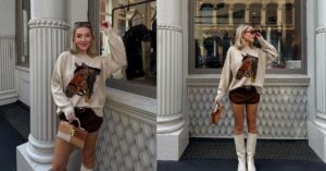 The cozy full-sleeved off-white sweater is a dream on cooler days, and when it’s matched with a cute mini skirt, it creates a sweet and sassy look. The Mary Jane loafers add just enough schoolgirl charm without being over the top.